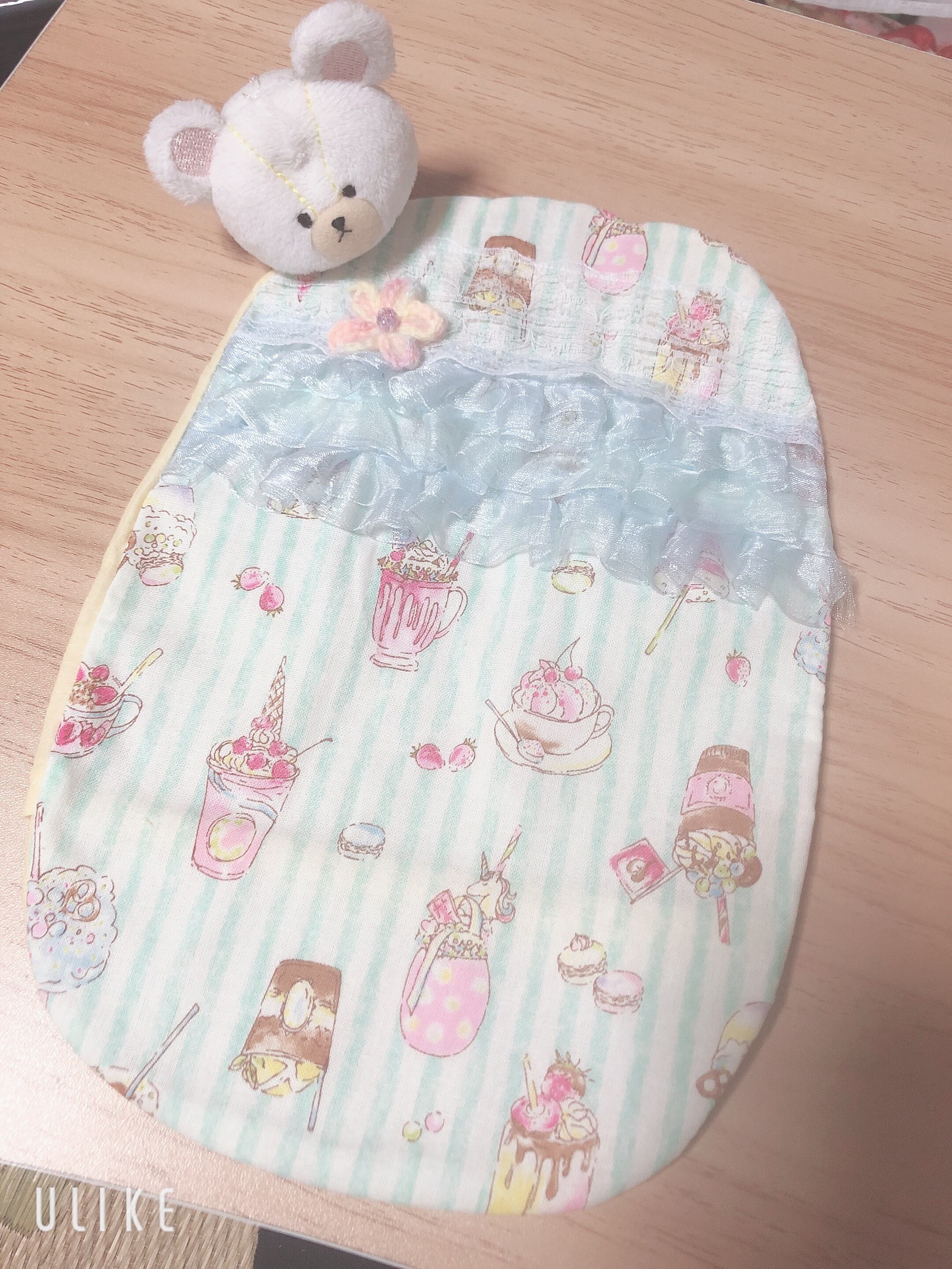 ストマーカバー、パフェ柄フワフワ水色レース(ワンポイント花付き)